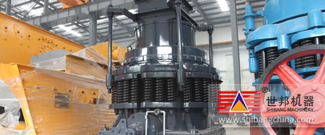 彈簧(huang)破(po)碎(sui)機工作時(shi),電(dian)動(dong)機通(tong)過水平軸(zhou)(zhou)和一(yi)對(dui)傘齒輪帶動(dong)偏(pian)心軸(zhou)(zhou)套(tao)旋轉(zhuan),破(po)碎(sui)圓(yuan)錐軸(zhou)(zhou)心線(xian)在偏(pian)心軸(zhou)(zhou)套(tao)的迫(po)動(dong)下做旋擺運動(dong),使得破(po)碎(sui)壁表面時(shi)而靠近(jin)又(you)時(shi)而離開(kai)軋臼(jiu)壁的表面,從而使礦石在破(po)碎(sui)腔(qiang)內不斷地(di)受到(dao)擠壓和彎曲而被(bei)破(po)碎(sui)。